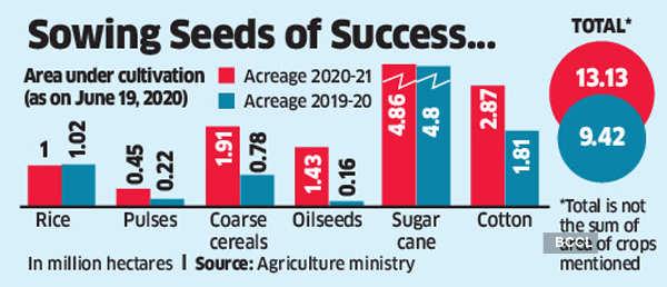NEW DELHI: Crop planting for the kharif, or summer-sown season, has jumped 40% year-on-year, helped by the strong start of the monsoon season. The surge in planting has been led by oilseeds and coarse cereals. Rainfall since June 1 has been 31% higher than that a year ago, giving a big boost to crop planting.