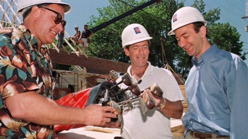 Photos: Amazon founder Jeff Bezos Gregory Nixon, left, delivers a set of antique golf clubs he sold to David Robichaud, center, via Amazon.com Auctions in 1999. Bezos was there for the moment, as Robichaud, a construction worker, was Amazon’s 10-millionth customer.Hide Caption 5 of 31