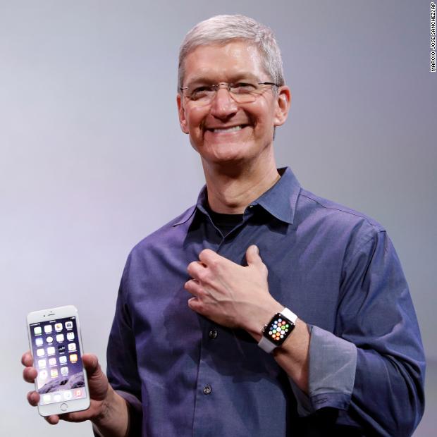 Photos: Apple CEO Tim CookCook, holding an iPhone 6 Plus and wearing an Apple Watch, discusses the new products during an event in Cupertino on September 9, 2014.Hide Caption 5 of 28