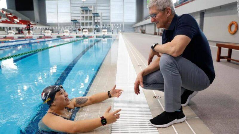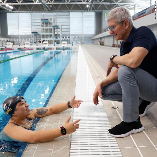 Photos: Apple CEO Tim CookCook speaks with Singapore Paralympian Theresa Goh about the Apple watch she uses for training at the OCBC Aquatic Centre in Singapore on December 12, 2019. Hide Caption 25 of 28