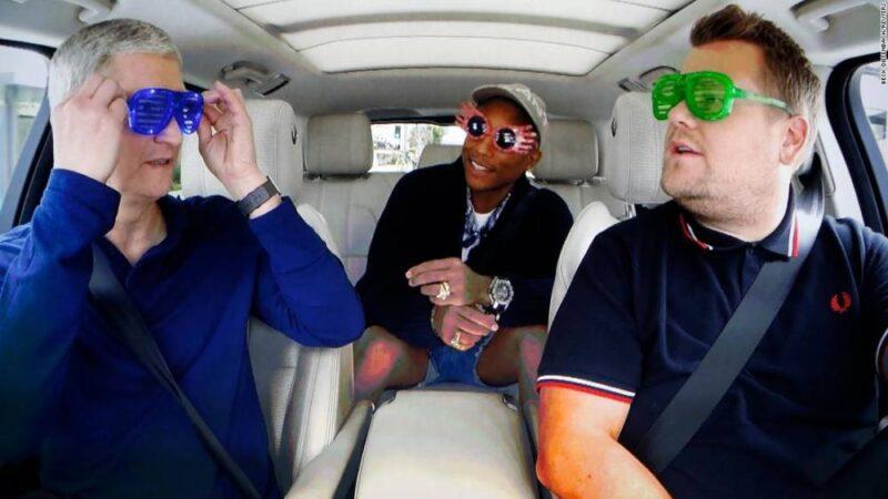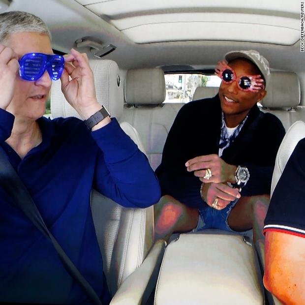 Photos: Apple CEO Tim CookCook with James Corden and Pharrell during a taped comedy bit shown on a projection screen during an Apple event in San Francisco on September 7, 2016. Hide Caption 15 of 28