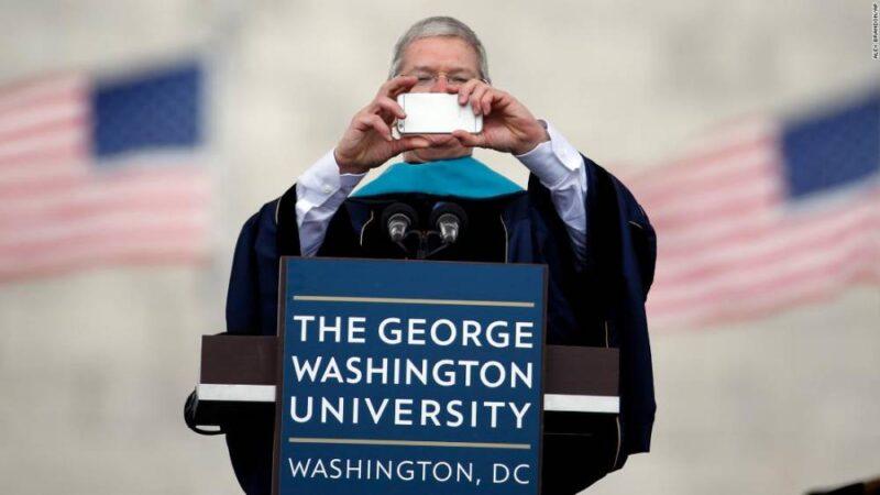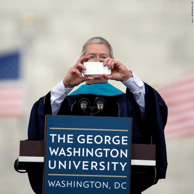 Photos: Apple CEO Tim CookCook takes a photo with his iPhone while addressing graduates during George Washington University’s commencement exercises on the National Mall on May 17, 2015. The university awarded Cook with an honorary doctorate of public service. Hide Caption 9 of 28