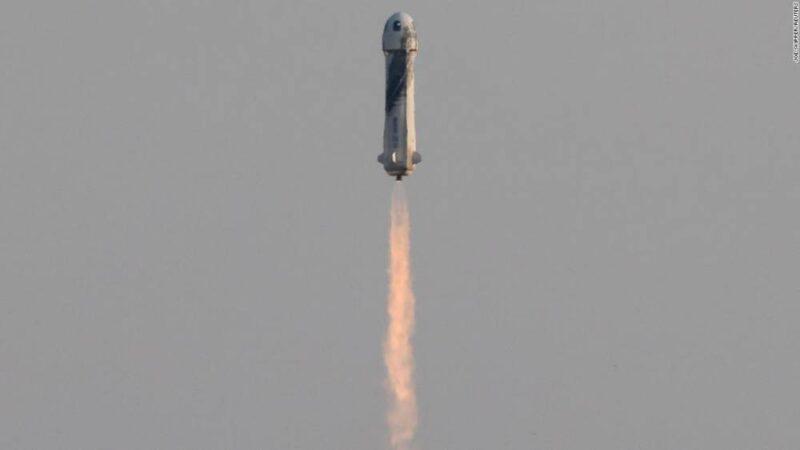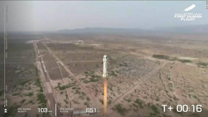 The Blue Origin capsule, with Jeff Bezos and crew inside, rockets off from the ground.The four passengers on Tuesday strapped into their New Shepard crew capsule at Blue Origin’s launch site in rural West Texas just before the rocket lit its engines at 8:12 am CT, sending the vehicle blaring past the speed of sound and up to more than 65 miles above the desert landscape, topping out at an altitude of 351,210 feet. At the peak of the flight path, the passengers were weightless for about three minutes and were allowed to unstrap themselves from their seat to float around and soak in panoramic views of the Earth and the cosmos.