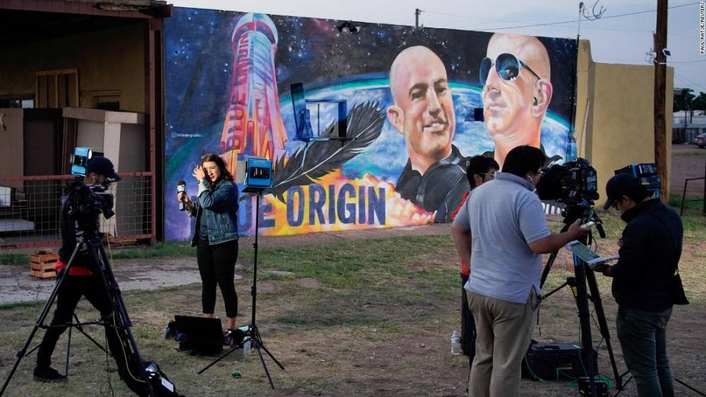 Photos: Jeff Bezos' historic flight to spaceReporter Celina Quintana Ortiz prepares to go live from Van Horn on Tuesday in front of a mural depicting Jeff and Mark Bezos.Hide Caption 9 of 9