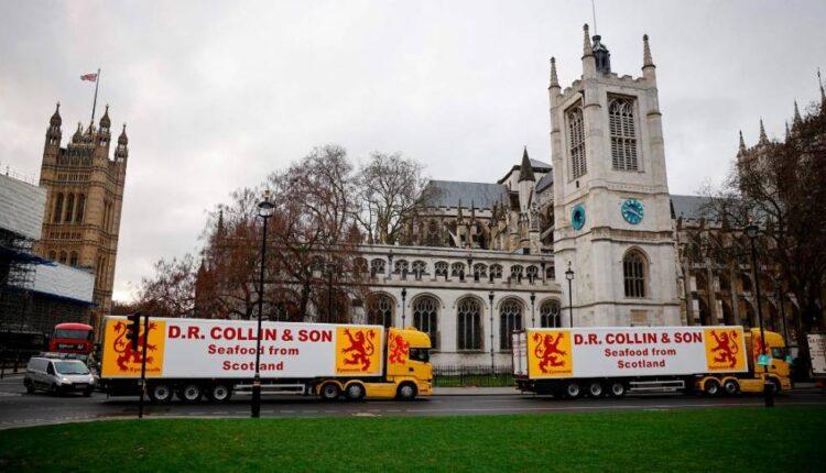 A truck drives past the Houses of Parliament in a protest against post-Brexit red tape.