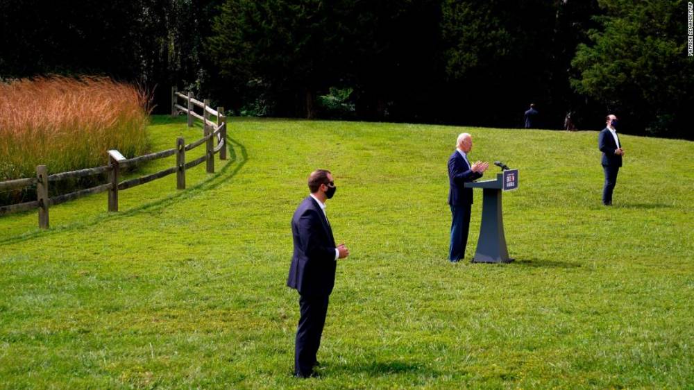 Photos: A tale of two campaignsBiden speaks in Wilmington, Delaware, about climate change and the wildfires ravaging areas in the western United States. “Donald Trump’s climate denial may not have caused these fires and record floods and record hurricanes, but if he gets a second term, these hellish events will continue to become more common, more devastating and more deadly,” Biden said on September 14.Hide Caption 73 of 98