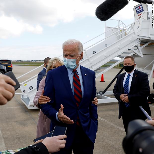 Photos: A tale of two campaignsBiden is reminded by his wife, Jill, to maintain proper social distancing as he speaks to reporters at an airport in Miami on October 5.Hide Caption 59 of 98