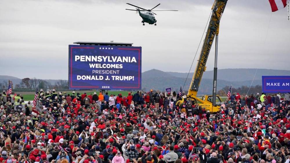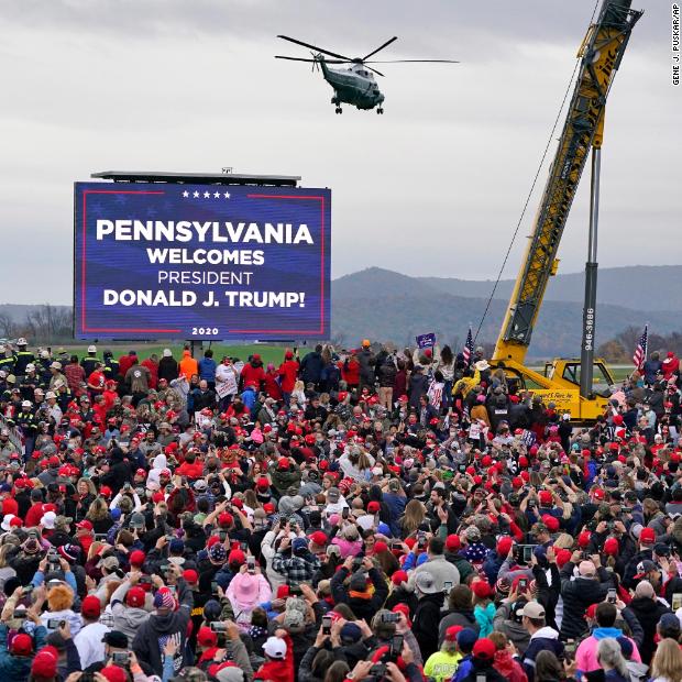 Photos: A tale of two campaignsMarine One lands at an airport in Martinsburg, Pennsylvania, where a Trump rally was taking place on October 26.Hide Caption 33 of 98