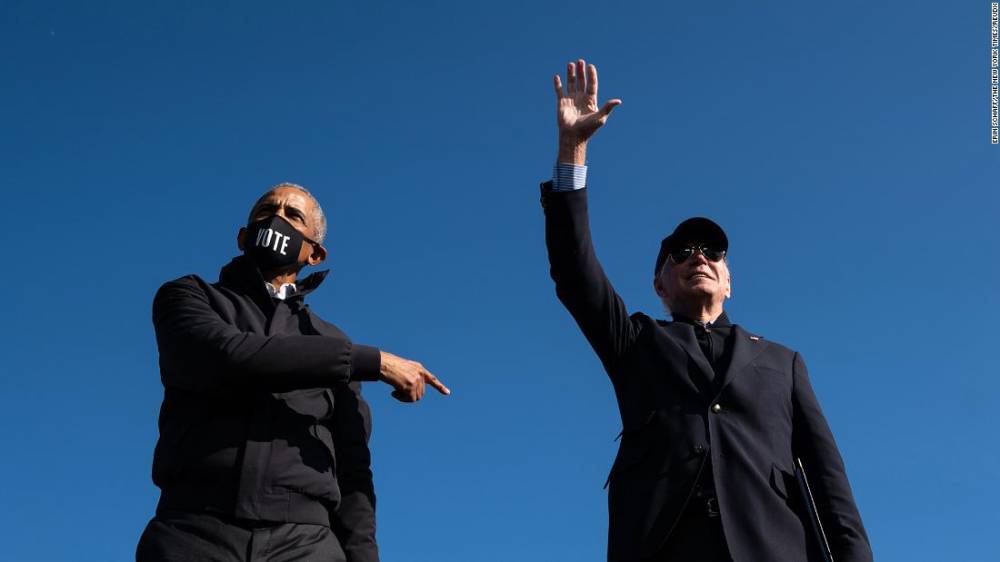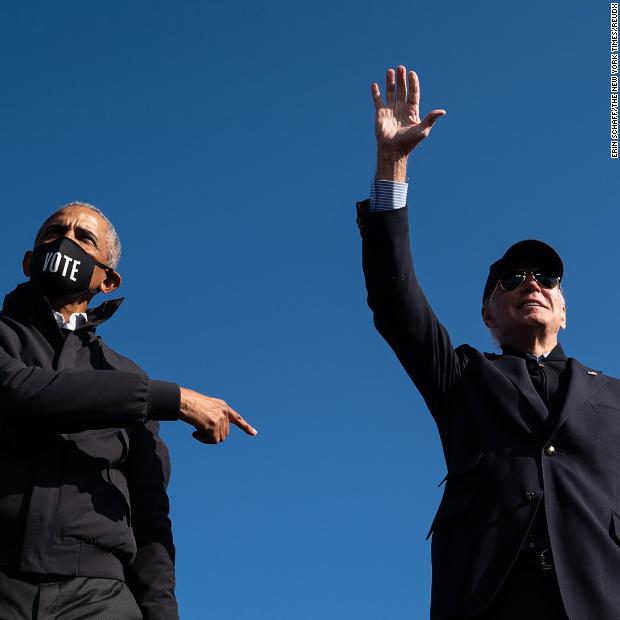 Photos: A tale of two campaignsFormer President Barack Obama points to Biden after speaking at a drive-in rally in Flint, Michigan, on October 31. Hide Caption 17 of 98