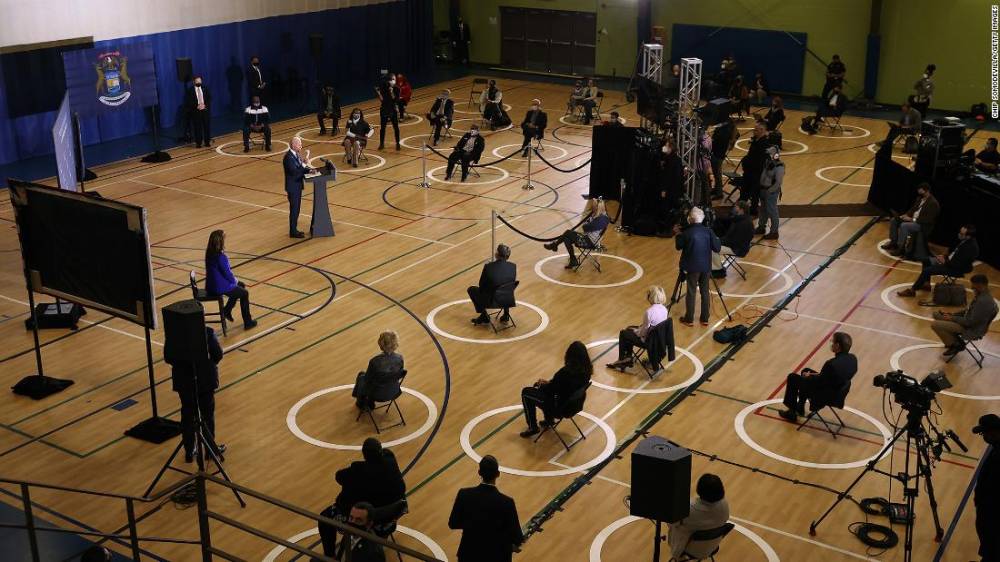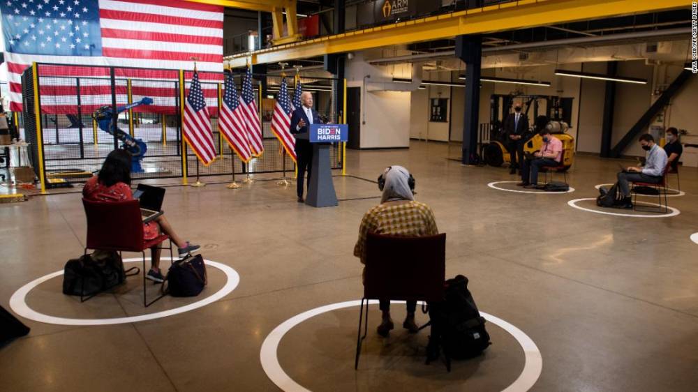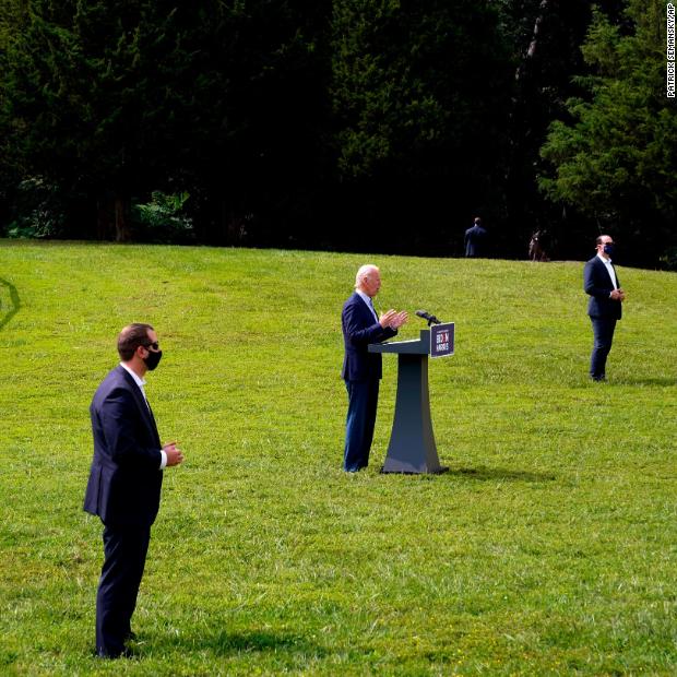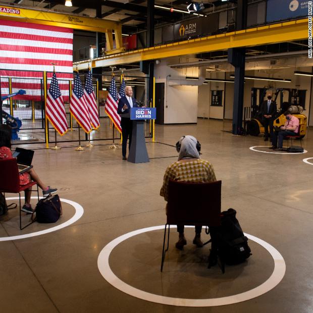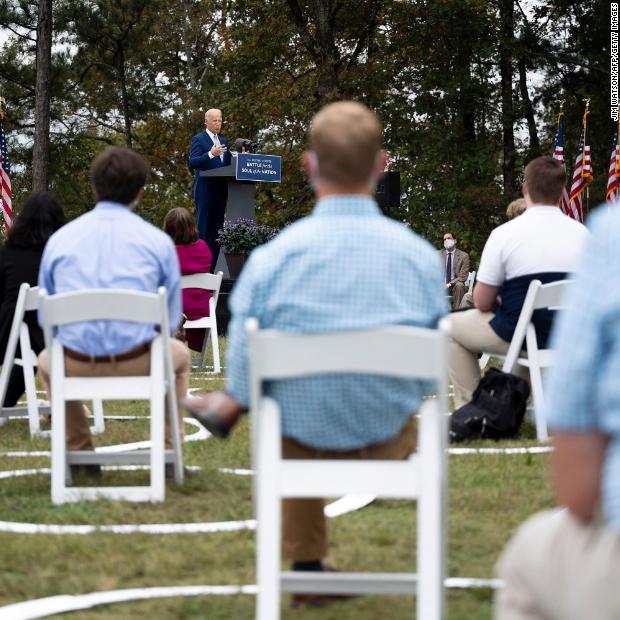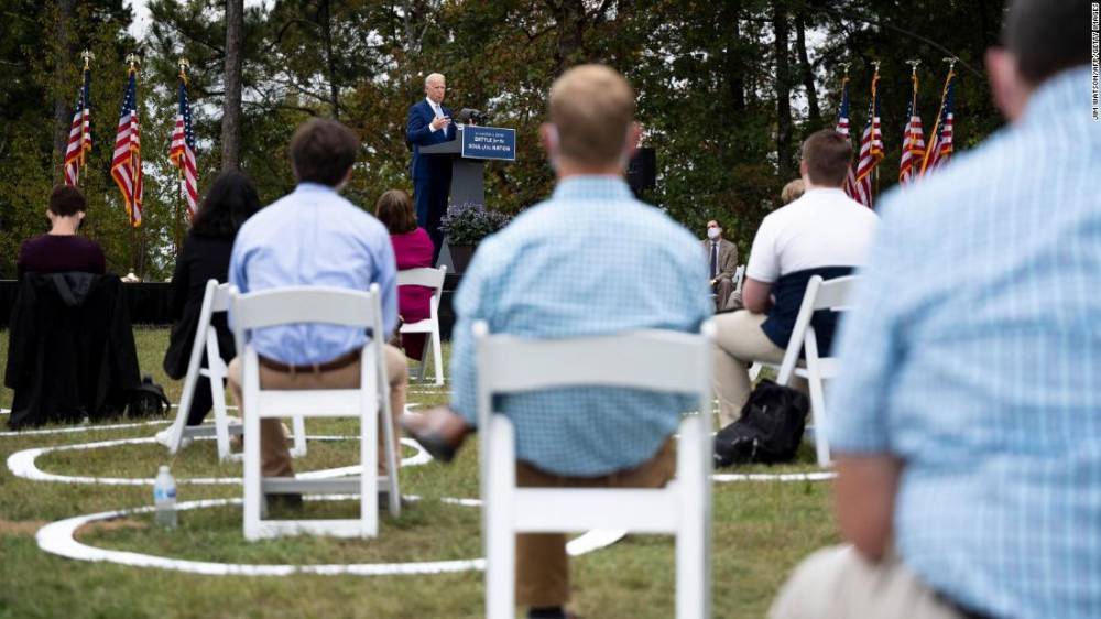 Guests and journalists sit in socially distanced circles as Democratic presidential nominee Joe Biden speaks at a campaign event in October.But the upside, this reporter said, was that because they were at a literal arm’s length, no one felt threatened by Covid-19 the way some Trump beat reporters did.”It’s shocking, really, that this was distinct, but the Biden campaign should be commended [for] the steps it took to protect the health of everyone on staff, among supporters and among reporters,” the reporter said.Multiple Trump beat reporters, on the other hand, likened the final stretch of his campaign to a coronavirus super-spreader tour.