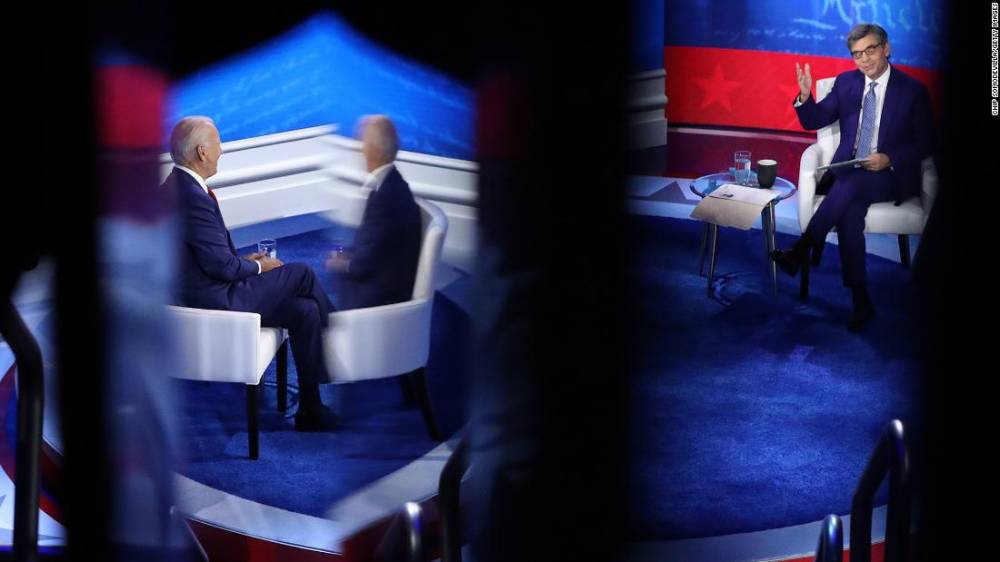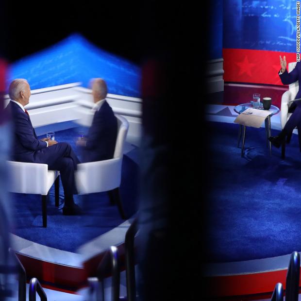 Photos: A tale of two campaignsBiden sits across from ABC News’ George Stephanopoulos before the start of his town hall event in Philadelphia on October 15. Biden and Trump were originally scheduled to meet face to face and take questions from voters in a town-hall setting. Instead, they held separate town halls. The change came about after Trump was diagnosed with the coronavirus earlier this month. The Commission on Presidential Debates proposed a virtual debate, but Trump refused to take part and Biden went ahead with plans for his own town hall. Trump’s campaign later arranged its own town hall — on a different network, during the same hour.Hide Caption 51 of 98