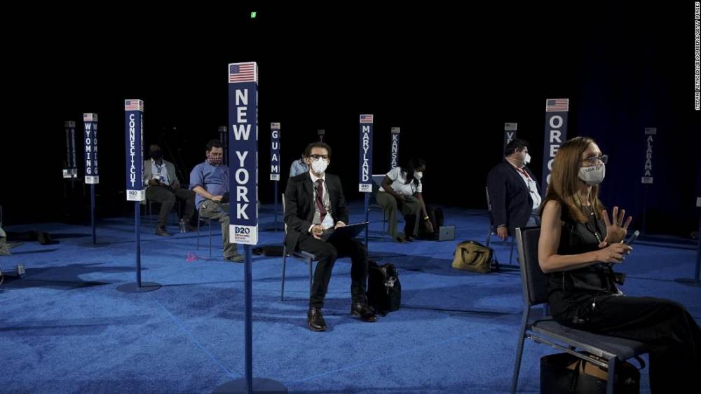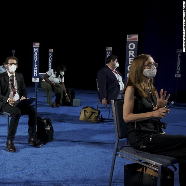 Photos: A tale of two campaignsMembers of the media are spread out from one another before Harris’ speech during the Democratic National Convention.Hide Caption 89 of 98