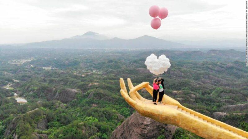 The things we do for love: A couple poses on a Buddha’s hand statue built on a cliff at the Shiniuzhai National Geological Park in China’s Hunan province. May 20 is celebrated as “I love you day” due to the date sounding like that phrase in Mandarin. Not everyone was happy on Thursday however — two local governments had to scrap plans to suspend divorces for the day after a public backlash.