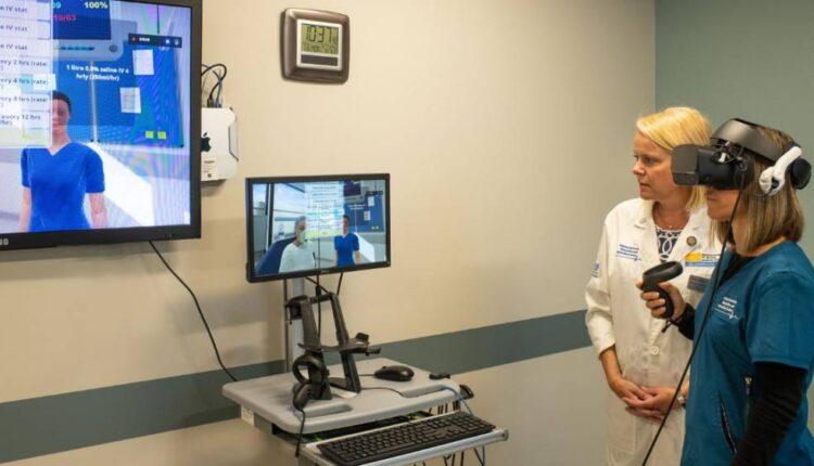A nursing student at The University of New England undergoes a VR simulation to get ready for real-world hospital situationsBut because time and resources are limited, the door has opened for technologies like VR to fill in the gaps. Considering how the medical industry has long been an early adopter of VR, from using it as distraction therapy for medical procedures or even at the dentist, to a training method for surgeons, it’s a natural place for hospitals to turn.”We’ve found it very valuable to observe a [doctor’s thinking] process — and it’s all been done with social distancing,” Metcalfe-Smith said. “Because we can’t get large groups together right now, we’ve had to rely on technology like this to give the same experience — and we’re grateful for that.”The hospital uses software from startup Virti, which provides detailed feedback and metrics on which procedures medical professionals may need more practice with. Cedars-Sinai started using the program in January but rolled it out to more health professionals in mid-March as the outbreak spread.”We wanted the exercises to embody what is happening in the real-world right now,” said Virti founder Dr. Alex Young. “One simulation puts the user alone in an isolation room, where they can see nurses and doctors come in and out, so they can get an idea of how scary it is for patients. It’s easy to forget the basics of communicating through the masks, so scenarios like this help with bedside manner.”The company signed up 70,000 new users in the past three weeks across hospitals and universities in the US, UK and Israel. Typically, trainees learn in environments watched by evaluators and their peers behind a glass wall. In such a scenario, a mannequin, controlled remotely, acts as the patient. But a virtual simulator lets medical professionals practice the skills they need through a VR headset or a tablet, at the hospital or at home.Boston-based Oxford Medical Simulation is also focused on improving the decision-making process for practitioners in emergency situations. Its scenarios range from how to efficiently and safely put on protective gear to more intensive situations with sick patients.