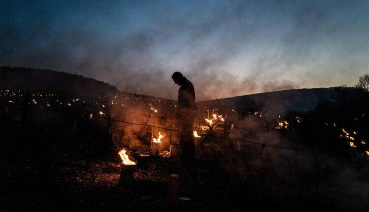 A man checks vine buds as anti-frost candles burn in the Luneau-Papin vineyard near Nantes on April 12.Climate change has brought forward growing seasons in France and elsewhere, placing crops at higher risk of damage from cold spells. “It’s when they begin to grow that they are more fragile,” said Colombo, adding that temperature changes have also affected harvesting. “Now we harvest in the first week of September and [20 years ago] it was the last week of September,” she said.