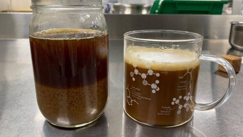 Plant-based milk doesn’t mix well with coffee, as seen on the left. Coffee with Impossible’s prototype, on the right, is designed to be creamier.