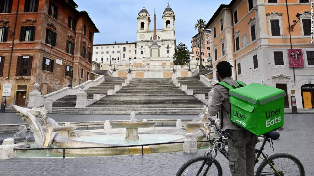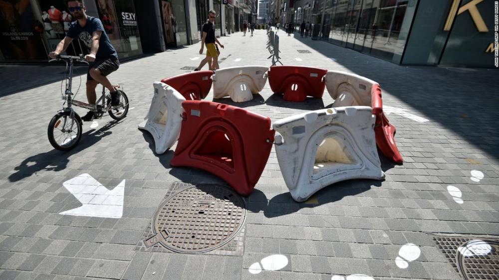 Photos: The novel coronavirus outbreak A man rides past social-distancing markers in front of a shop in Brussels, Belgium, on May 9.Hide Caption 68 of 337
