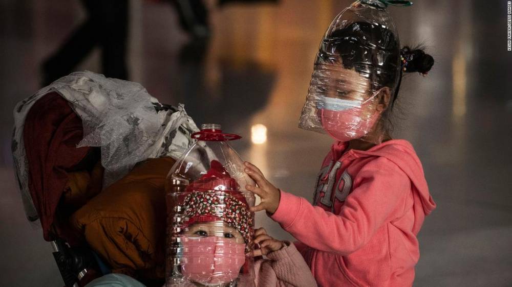 Photos: The novel coronavirus outbreak Children wear plastic bottles as makeshift masks while waiting to check in to a flight at the Beijing Capital Airport on January 30.Hide Caption 308 of 337