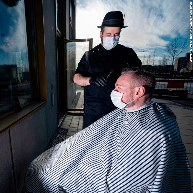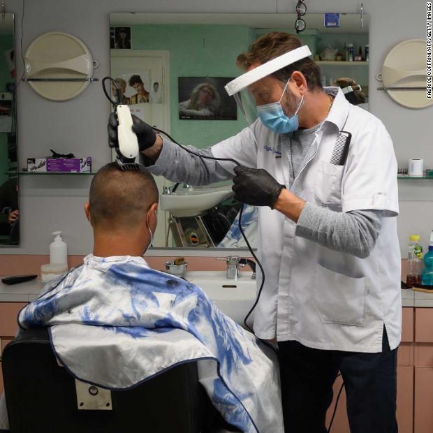Photos: The novel coronavirus outbreak A barber wears protective equipment as he cuts a customer’s hair in Lausanne, Switzerland, on April 27.Hide Caption 83 of 337