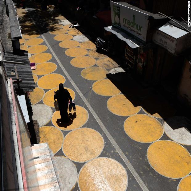 Photos: The novel coronavirus outbreak A woman walks along a road painted with circles to help people maintain social distancing in Mumbai, India, on June 29.Hide Caption 21 of 337