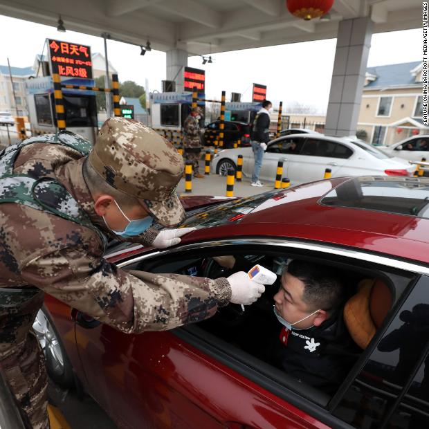 Photos: The novel coronavirus outbreak A militia member checks the body temperature of a driver in Wuhan on January 23.Hide Caption 329 of 337