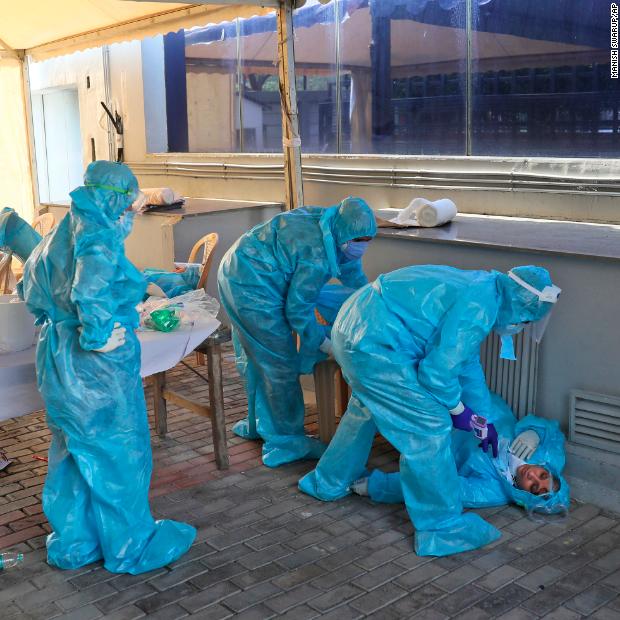 Photos: The novel coronavirus outbreak Health workers at a coronavirus testing center in New Delhi attend to a colleague who fainted due to exhaustion on April 27. Hide Caption 85 of 337