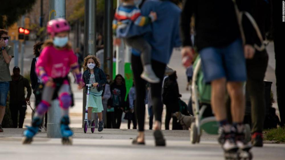 Photos: The novel coronavirus outbreak Families walk along a boulevard in Barcelona, Spain, on April 26. The government now allows children to go out once a day, for one hour, within about half a mile of their homes, with one adult who lives with them. Up to three kids can go with each adult.Hide Caption 86 of 337