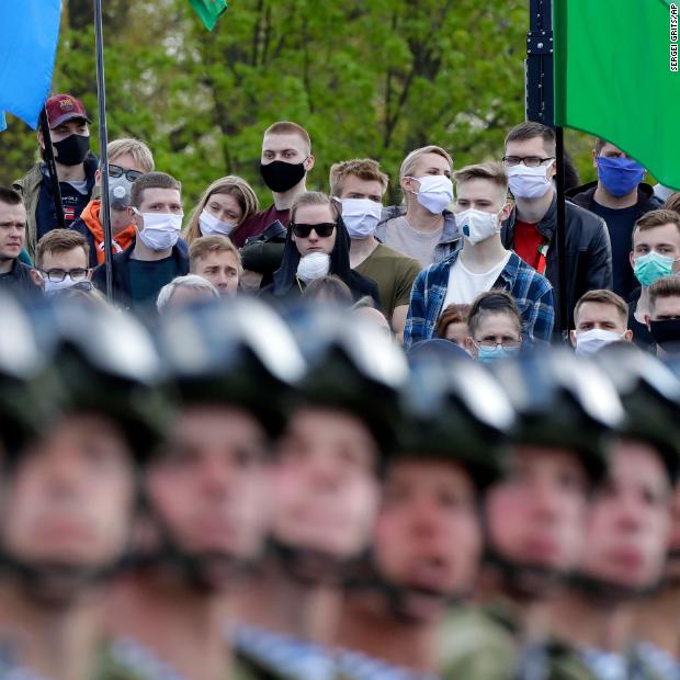 Photos: The novel coronavirus outbreak People wear face masks while watching a Victory Day military parade in Minsk, Belarus, on May 9. The parade marked the 75th anniversary of the Allied victory over Nazi Germany in World War II.Hide Caption 67 of 337