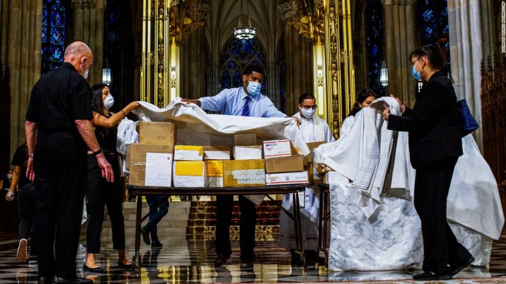 Photos: The novel coronavirus outbreak The boxed cremated remains of Mexicans who died from Covid-19 are covered before a service at St. Patrick’s Cathedral in New York on Saturday, July 11. The ashes were blessed before they were repatriated to Mexico.Hide Caption 10 of 337