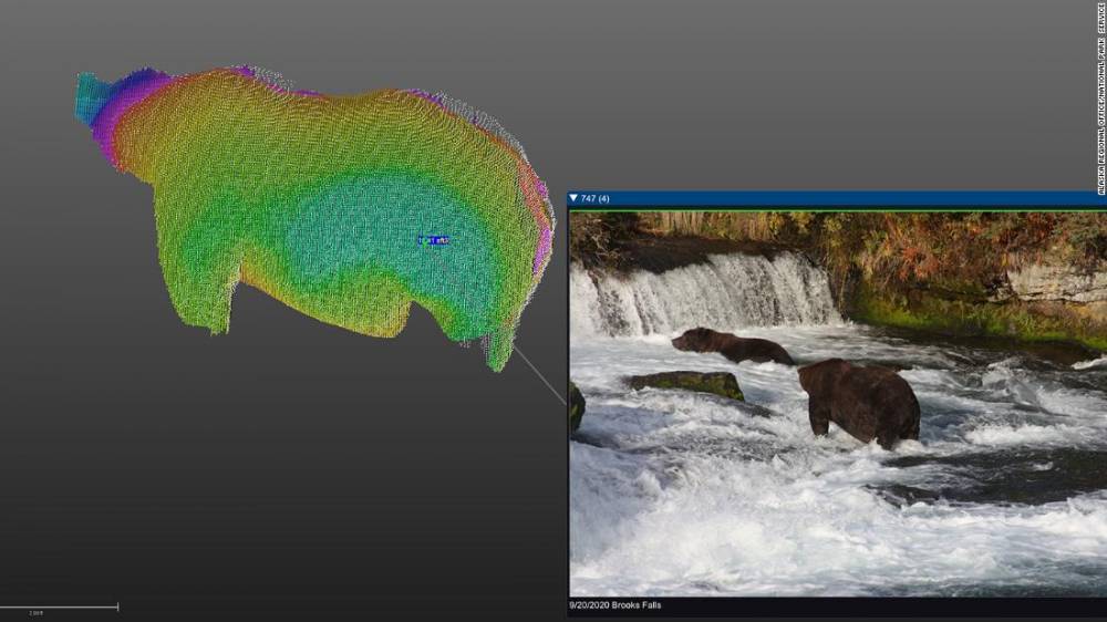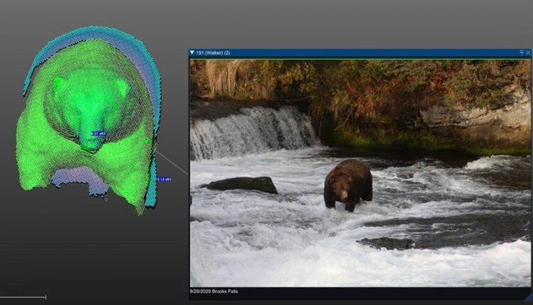 A 3-D model of 747 is shown next to a picture of the bear; 747 was the 2020 winner of Fat Bear Week at Katmai National Park and Preserve, and had the highest estimated weight.It’s currently impossible to know how accurate this method is, but Mangipane is hoping to validate the scanning technology by partnering with zoos to scan captive polar bears, whose weights are known since they can be trained to step on scales. Those known weights could be compared with weights derived from 3-D scans of the bears.Accuracy aside, Cusick said the results have been consistent: Last year, for instance, he and his colleagues used about 10 scans taken over several days of a bear known as 747. Two people independently estimated 747’s weight from each scan, yielding 20 estimates that averaged 1,416 pounds. Each of the individual estimates were within about 100 pounds, Cusick said, and the average was an eight-pound difference from the bear’s heft in 2019.747 was estimated to be the most voluminous bear last year, as well as the heaviest. He was also voted to the top of the bracket by Fat Bear Week voters.