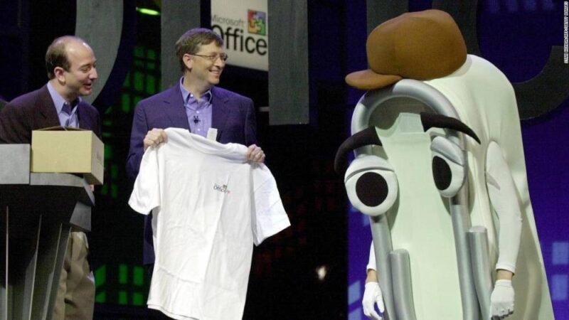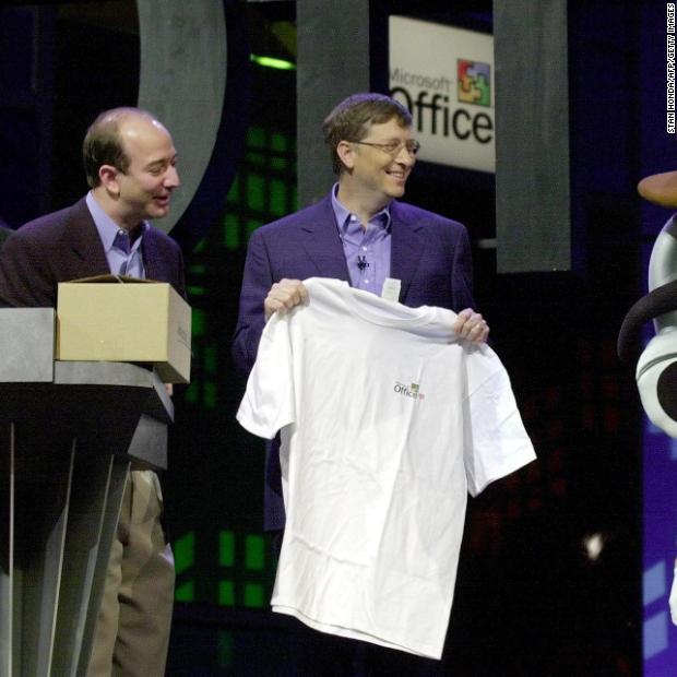 Photos: Amazon founder Jeff Bezos Bezos looks on as Microsoft CEO Bill Gates presents a T-shirt as a retirement gift to Clippy, the Microsoft Office assistant, in 2001. Microsoft was launching Office XP.Hide Caption 7 of 30