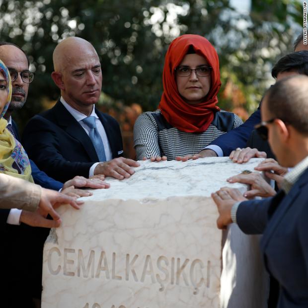 Photos: Amazon founder Jeff Bezos Bezos stands next to Hatice Cengiz, the fiancee of the late journalist Jamal Khashoggi, as a plaque is unveiled near the Saudi consulate in Istanbul in 2019. It was a year after Khashoggi, a Washington Post columnist, was killed.Hide Caption 27 of 30