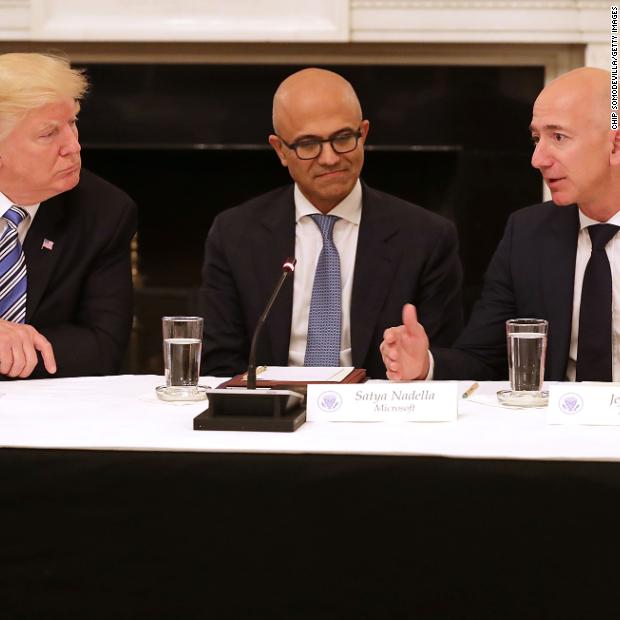 Photos: Amazon founder Jeff Bezos US President Donald Trump and Microsoft CEO Satya Nadella listen to Bezos at a White House meeting of the American Technology Council in 2017. According to the White House, the council’s goal is “to explore how to transform and modernize government information technology.” Hide Caption 21 of 30