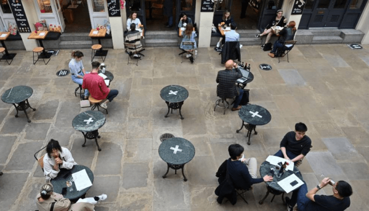 Customers sit at socially distanced tables in Covent Garden in London on July 4.