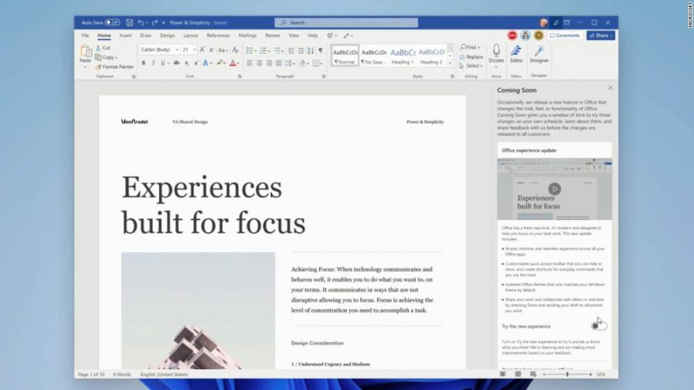 This is what Word looks like now. Disgusting, amirite?The quick-access toolbar, which had allowed you to place frequently used commands at the very top of your Office apps, will be disabled by default in the new version of Office. You can enable it if you want, but the commands will appear below the ribbon, rather than above it to maintain the cleaner new look.The new Office is just a visual overhaul — it doesn’t have much in the way of new features. Office 365 customers who sign up to be beta testers will soon be able to try out the new look by enabling the “coming soon” experience. The new look will be available to customers who are running Windows 10 or Windows 11 on their PCs.