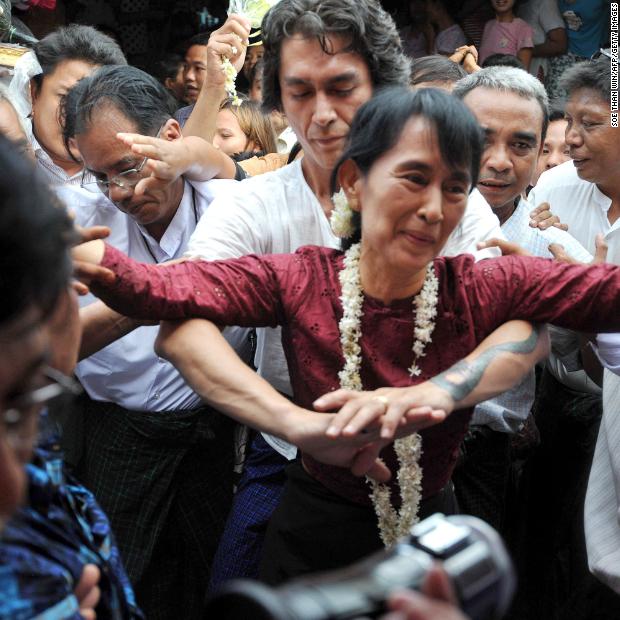 Photos: Aung San Suu KyiSuu Kyi makes her way through a crowd in 2012, a day after she won a seat in parliament. It was Myanmar’s first multiparty elections since 1990.Hide Caption 17 of 37
