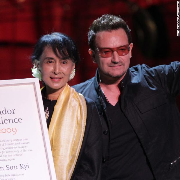 Photos: Aung San Suu KyiSuu Kyi accepts the Ambassador of Conscience Award next to U2 singer Bono during a European tour in 2012.Hide Caption 18 of 37