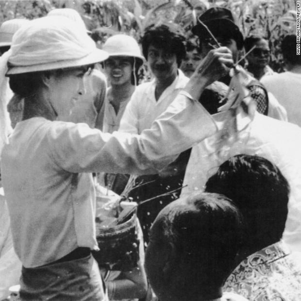 Photos: Aung San Suu KyiSuu Kyi sprinkles water over the heads of her followers during a traditional new year ceremony in Yangon in 1989. Five days of celebrations were marked by anti-government protests closely watched by armed troops.Hide Caption 4 of 37