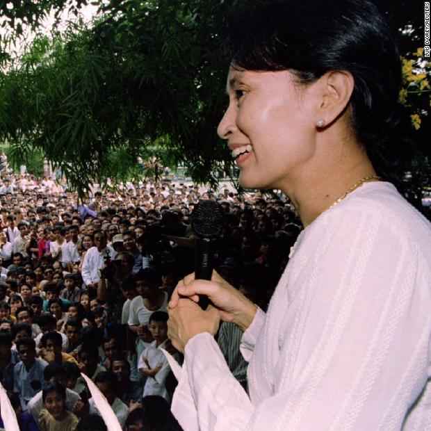 Photos: Aung San Suu KyiSuu Kyi speaks to hundreds of supporters from the gate at her residential compound in Yangon in 1995. She had just been released from house arrest, but her political activity was restricted.Hide Caption 8 of 37