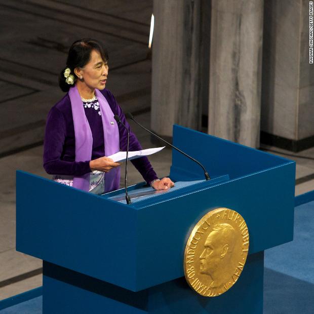 Photos: Aung San Suu KyiSuu Kyi speaks during a Nobel lecture in Oslo, Norway, in 2015. She was finally able to receive the Nobel Peace Prize that she won while she was under house arrest in 1991.Hide Caption 22 of 37