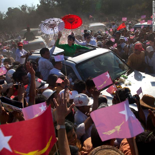 Photos: Aung San Suu KyiSuu Kyi greets crowds while campaigning in Pathein, Myanmar, in 2012. She was running for a seat in parliament.Hide Caption 16 of 37