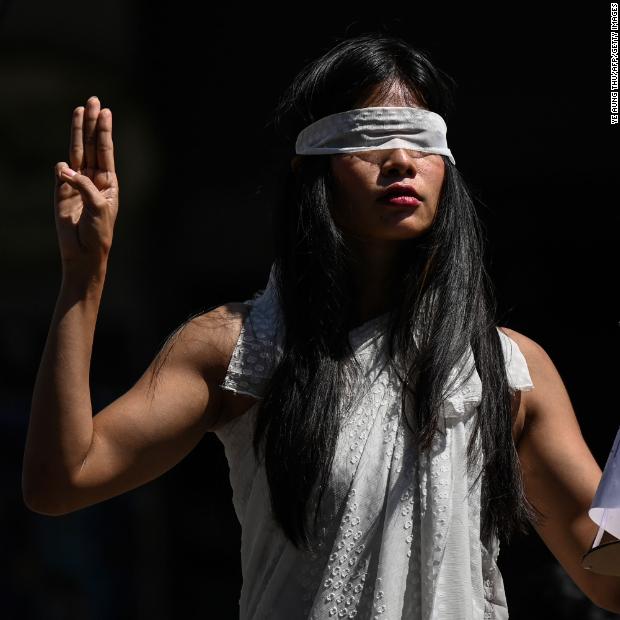 Photos: Unrest in MyanmarA protester dressed as Lady Justice makes a three-finger salute as she takes part in a demonstration in Yangon on February 11.Hide Caption 65 of 82