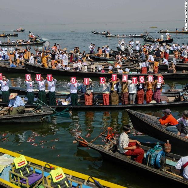 Photos: Unrest in MyanmarPeople hold up letters that spell “get out dictators” during a demonstration at Inle Lake on February 11.Hide Caption 69 of 82