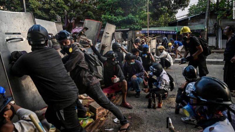 Protesters take cover behind homemade shields as they confront the police during a crackdown on demonstrations against the military coup in Yangon on March 16.Thousands of people fled Hlaingthaya on Tuesday after it was placed under martial law, according to Reuters and local media Frontier Myanmar. Images showed residents carrying their belongings as they packed into cars, tuk tuks and trucks. Speaking to Reuters, a labor organizer in Hlaingthaya said, “here is like a war zone, they are shooting everywhere,” and added most residents were too frightened to go outside.Two doctors told Reuters there were wounded people in need of medical attention in the area, but the army had sealed its entrances.Matthew Smith, CEO of Fortify Rights, said on Twitter more killings were reported in Hlaingthaya on Tuesday, however, emergency vehicles were unable to access the area due to road blocks.Local media have reported a heavy police presence in the six Yangon townships under martial law. Anyone arrested in these areas can now be tried by military courts, with sentences including imprisonment, hard labor and the death penalty, according to Human Rights Watch. Martial law under the junta’s regime means the military commander of the Yangon region is given “full administrative and judicial authority” in districts where martial law is declared, local media outlet Myanmar Now reported.”Effectively, martial law means that the military has complete control over these areas, rather than working through civilian administrators or judges,” said Melissa Crouch, law professor at the University of New South Wales, Australia and author of “The Constitution of Myanmar,” on her website.