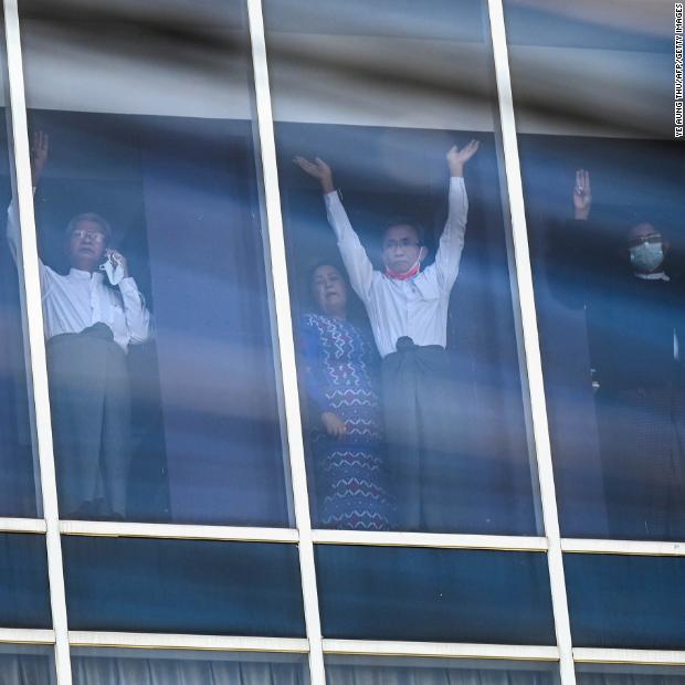 Photos: Unrest in MyanmarElected members of Parliament wave to protesters in Yangon as police surround the headquarters of Suu Kyi’s political party, the National League for Democracy, on February 15.Hide Caption 55 of 82