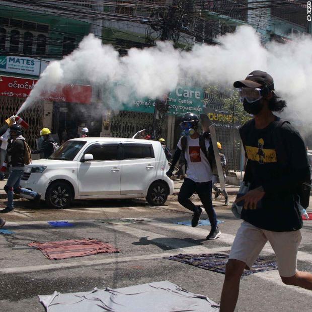 Photos: Unrest in MyanmarAnti-coup protesters run in Yangon on March 3. One of them discharged a fire extinguisher to counter the impact of tear gas fired by police.Hide Caption 23 of 82