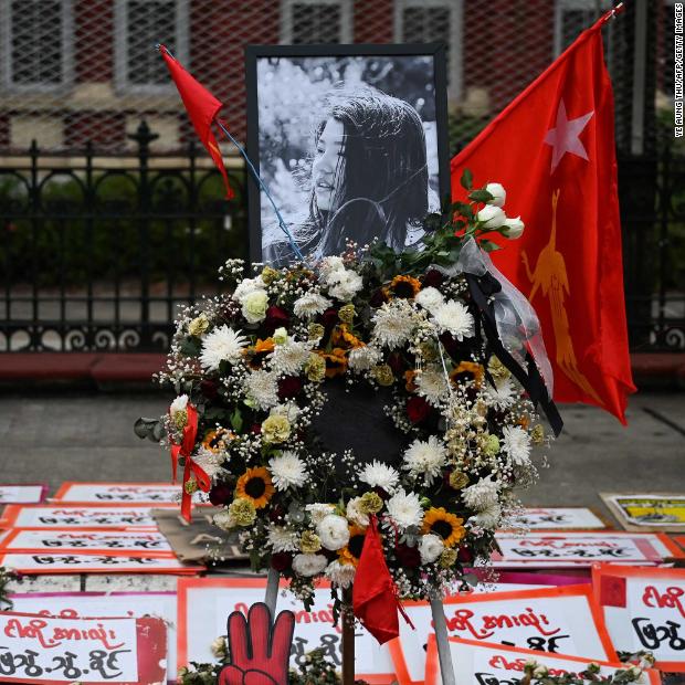 Photos: Unrest in MyanmarFlower tributes and sympathy messages are left in Yangon for Mya Thweh Thweh Khine. The 20-year-old was shot in the head at a protest in Naypyidaw, and she died on February 19.Hide Caption 49 of 82