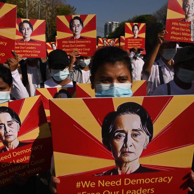 Photos: Unrest in MyanmarProtesters hold signs featuring civilian leader Aung San Suu Kyi during a demonstration in Yangon on February 22. Hide Caption 42 of 82