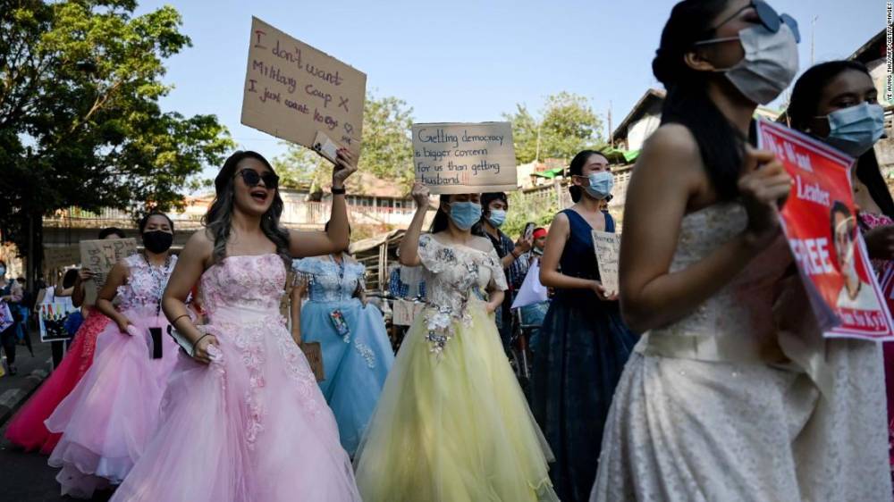 Photos: Unrest in MyanmarWomen in wedding gowns holds up anti-coup placards in Yangon on February 10.Hide Caption 71 of 82