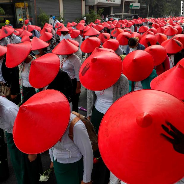 Photos: Unrest in MyanmarSchoolteachers wear traditional hats while participating in an anti-coup demonstration in Mandalay on March 3.Hide Caption 21 of 82